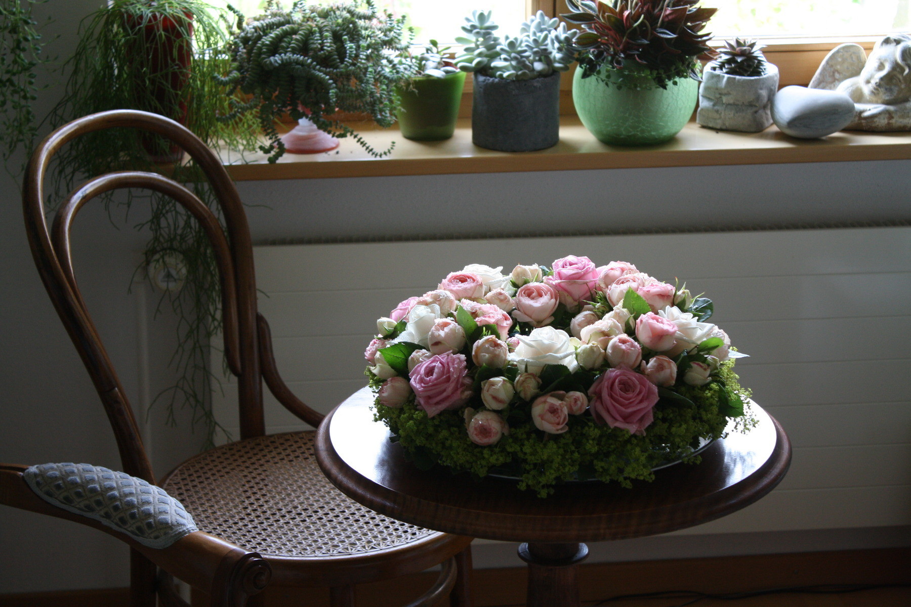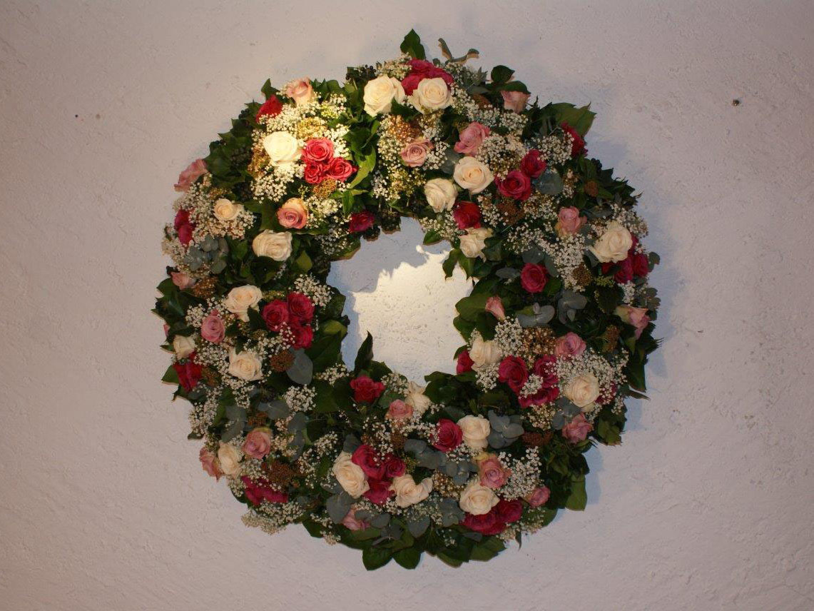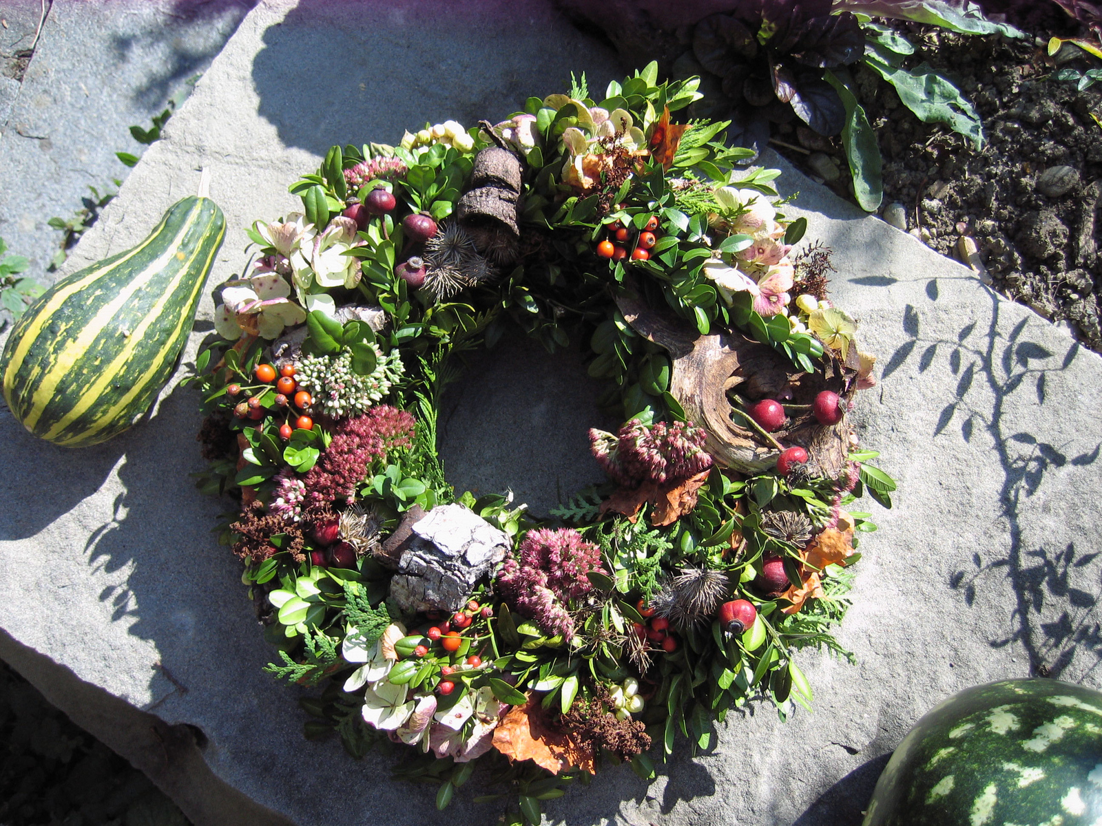 Formarbeiten Adventskranz mit Calocephalus Grosser Rosenkranz Herbstkranz Schleierkrautherz Kranz mit Rosen aus dem Hausgarten Festlicher Kranz < zur Übersicht